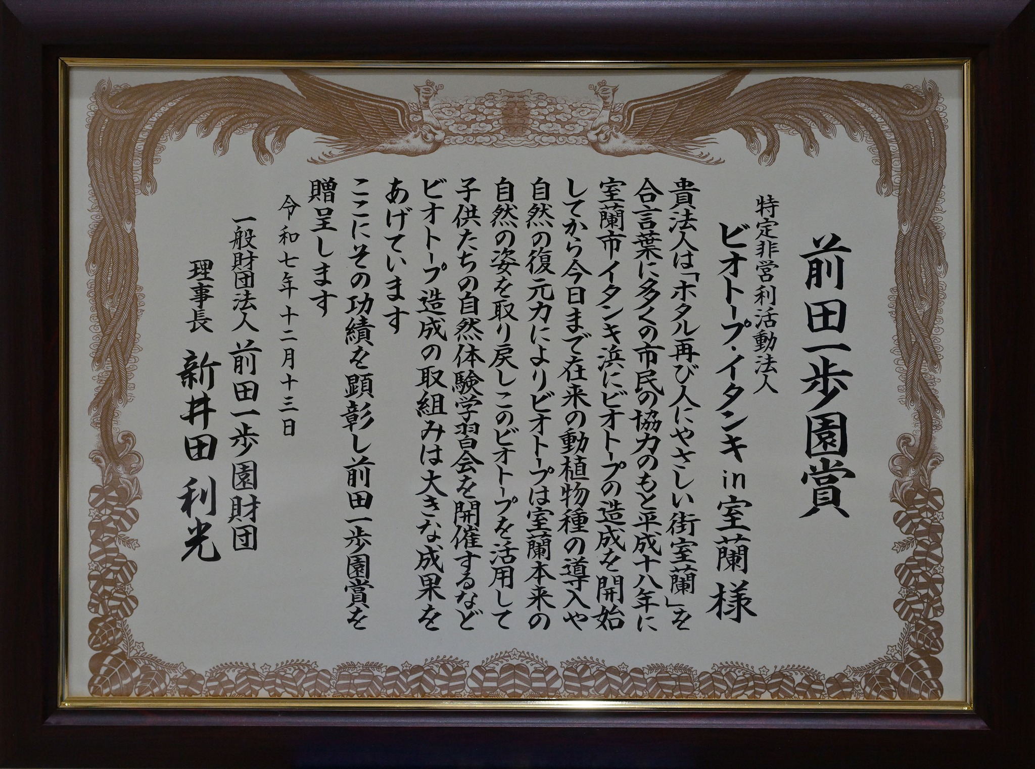北海道の自然環境の保全とその適正な利用に関して、道内各地で地道な努力を重ね、顕著な功績のあった個人や団体に贈呈される「前田一歩園賞」を受賞し、表彰式に参加しました。