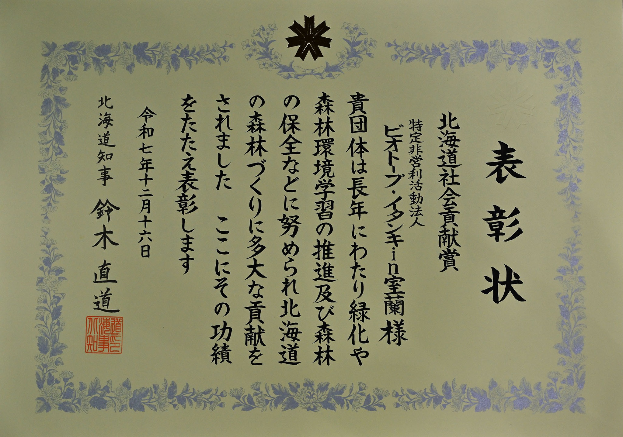 北海道より北海道社会貢献賞(森を守り緑に親しむ功労者)を受賞し、表彰式に参加しました。